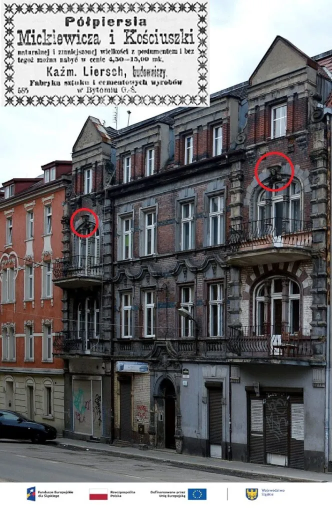 Najciekawszy jest przypadek kamienicy przy ul. Korfantego 25 w stylu neobaroku z 1897 r. Ów obiekt wyróżnia się na tle całego miasta ze względu na popiersia umieszczone w zwornikach nad balkonami na trzeciej kondygnacji. Analizując źródła archiwalne, natrafiłam w „Katoliku” z 1898 r. na ogłoszenie zamieszczone przez budowniczego Kaźm. Lierscha o treści: „Półpiersia Mickiewicza i Kościuszki naturalnej i zmniejszonej wielkości z postumentem i bez togoż można nabyć w cenie 4,50-15.00 mk. Kaźm. Liersch, budowniczy. Fabryka sztuku i cementowych wyrobów w Bytomiu G.-Ś.”.
