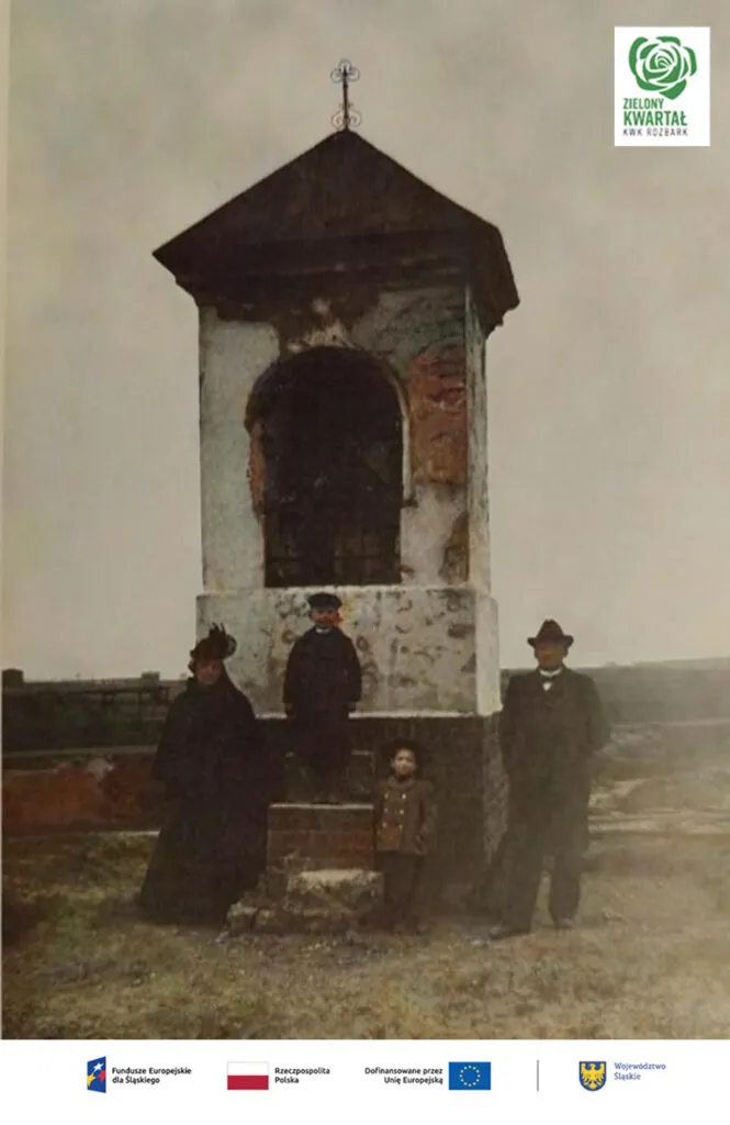„Idąc drogą z Rozbarku do Kamienia przyjdzie się na piaszczyste wzgórze, około 20 metrów wysokie, na którym już od wieków przy drodze stała kapliczka na murowanym słupie. Słup pod kapliczką miał 2 metry w kwadracie, a wysoki był na 11 metra. Na tym to słupie murowanym stała kapliczka 11 metrów wysoka, więc cała wysokość słupa i kapliczki wynosiła około 3 metrów. W kapliczce były trzy małe figury: