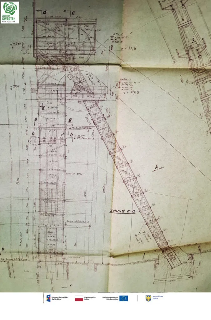 W teczce archiwalnej dawnej Kopalni Henitz odnalazłam rysunek dawnej wieży szybowej zaprojektowanej przez dyplomowanego inżyniera P. Waltera, który swoje biuro prowadził w Gliwicach. Spójrzcie tylko jak dokładnie wyliczono wszelkie elementy wieży.